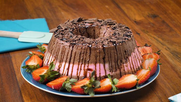 Numa forma com furo central, faça uma camada com o sorvete de chocolate.